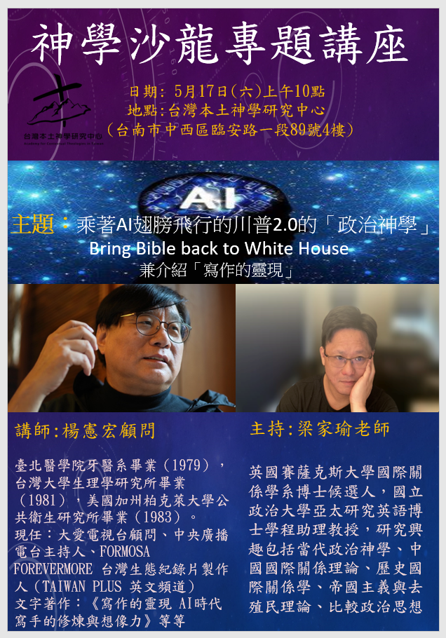 講員陳主顯,1965年自「台南神學院」神學本科畢業,隨之牧會於台南玉井、新化、台南東門等基督長老教會。在職中,就讀「東南亞神學研究院神學碩士課程」(1970-1972),師事蕭清芬博士,主修宗教學。完成後,在南神兼任講師,講授「台灣民間宗教」──請容一提,他的碩士論文是《從台灣俗語看民間信仰》。此文,對於俗語做為「宗教研究的素材」,略有心得。